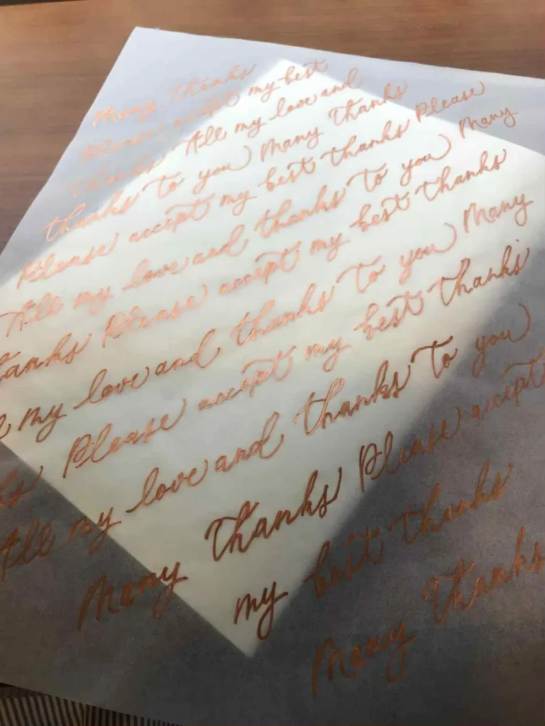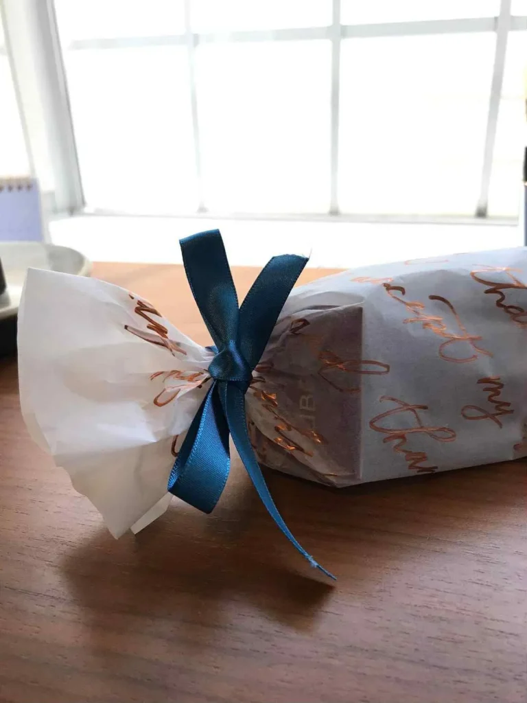インターネットでも、何かちょっとした小さいものだったり、そのままではなんとなく“モノ”感が出てしまうかな。と思うものには、私はトレーシングペーパーにカッパーゴールドのペンでカリグラフィーを入れて包んでリボンで留めています。