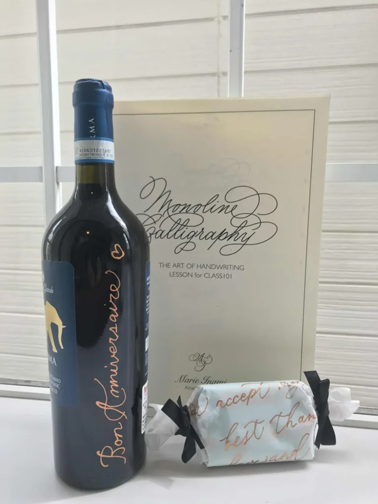 最終的に通信講座レッスンAinamyTOKYOで習ったカリグラフィーを使ってメッセージを伝える方法が一番私になじんでいたので、今では何かちょっとお渡しするときにもカリグラフィーを書いて包んだりメッセージやイニシャルを添えたりしていますが、手書きの文字に喜んでいただけることは多いです。