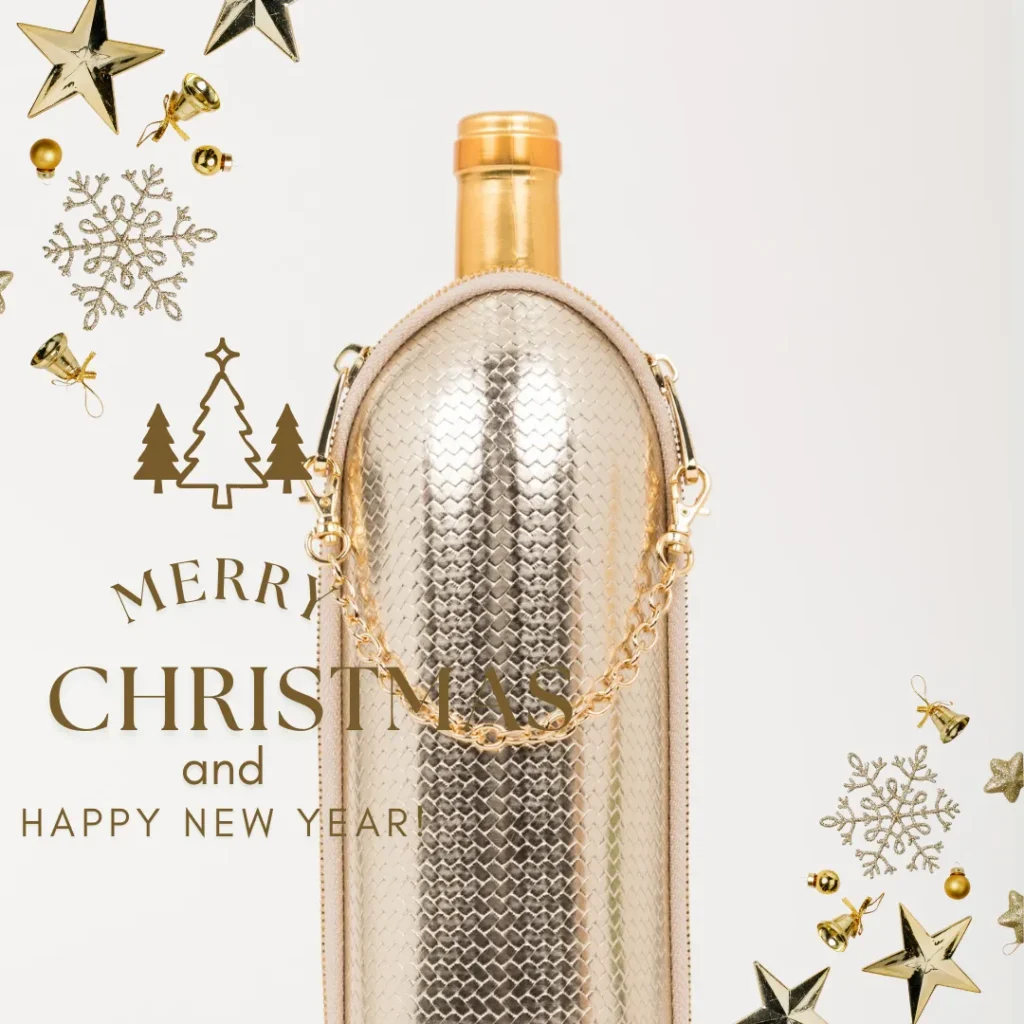 【スパークリング・イントレチャート】 プラチナゴールド地に、細かく編地の箔押しがされています。編地のエンボスにより、光が四方に飛び交いキラキラと輝くような見た目が印象的です。 シャンパンやスパークリングワイン等、発砲タイプのボトルで目安として15㎝くらいまでの高さまで横幅9.5cm以内の大きさのものに対応指定でするサイズです。 アクセサリーとして別売のチェーンをジップにとりつけることができます。 持ち手としては耐久しませんが、アクセントとなり華やかさが増します。 ぴったりした…