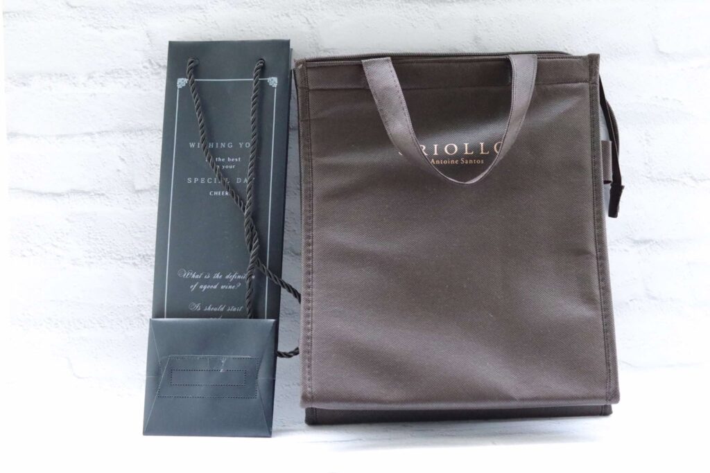 家にあるアイテムでなんとかする!派の方には、多きめのアルミが中に断熱材として使われる保冷バッグに保冷剤を入れれば、クーラーバッグになるのでおすすめです。この場合、ワインが重いので、しっかり耐久性のある強い保冷バッグを選ぶことが一番大切です。ケーキやさんでよくかわいい保冷バッグ(写真右:CRIOLLO保冷バッグ私物)が売られていてつい使いたくなりますが、ケーキとワインは重量が違うので、おすすめしません。安定感がないのですぐに不安になってボトルを取り出してしまうこと請け合いです。しっかり飲み物も入ることが想定された保冷バッグがいいですね!