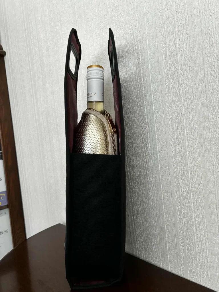 通常ワインを持ち運ぶ際には、写真左のようなワインバッグを使うことが多いと思います。もともとワイン用に作られているので、場所もとらずスマートに持ち運べますね。